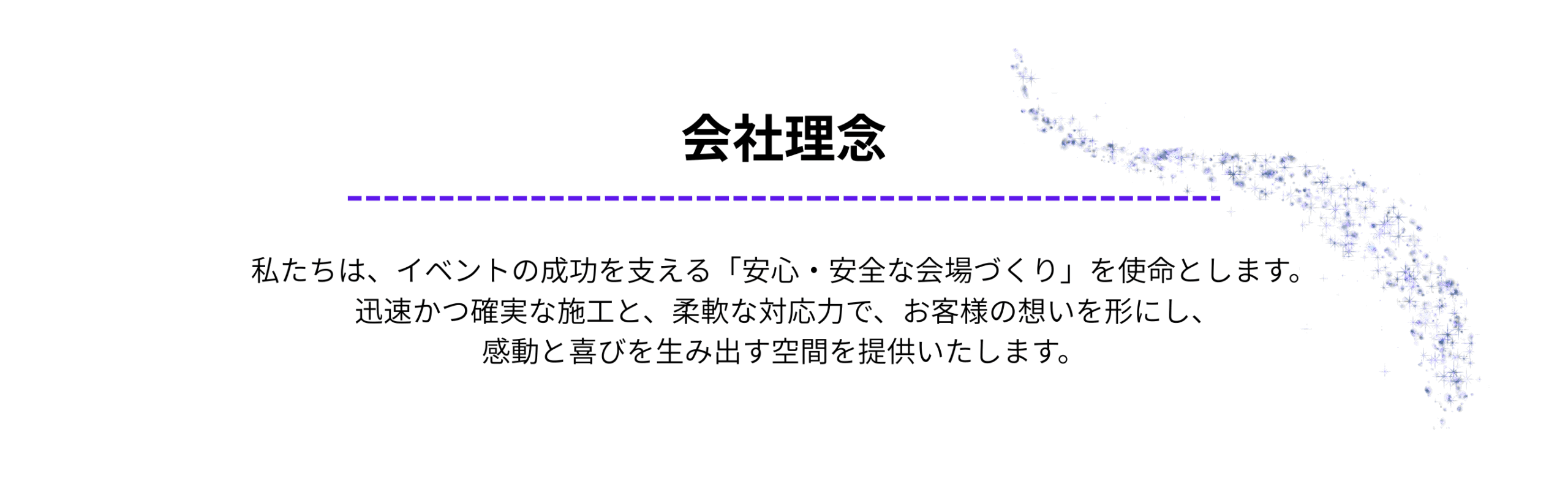 事業内容 | イベントの会場設営の請負 各種イベントの企画、運営及び管理 イベントの企画及び制作並びにそれらに関するコンサルティング |